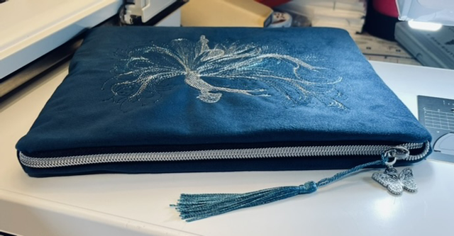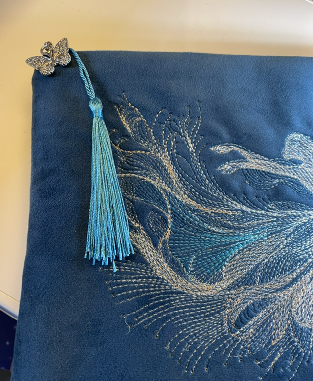 - Finished with a silver butterfly and silken Kingfisher blue tassel