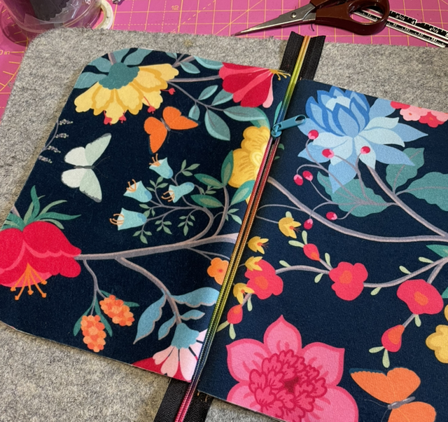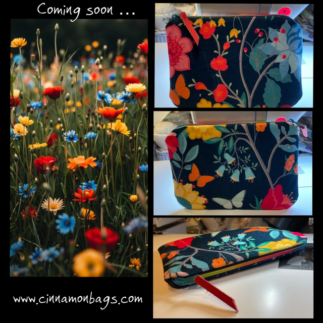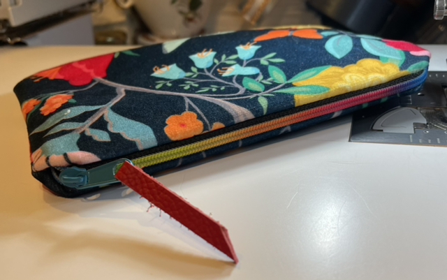 Butterflies and Flowers measures approximately 7 x 5 inches, and is made from printed cotton velvet by designer Celina Digby. It’s fully lined with a shiny black moiré fabric and closes with a rainbow zipper finished with a red leather tab.