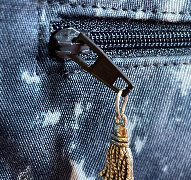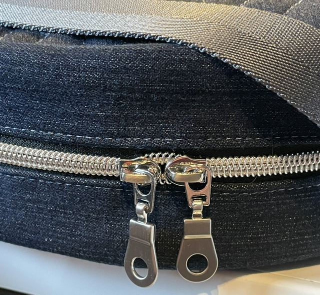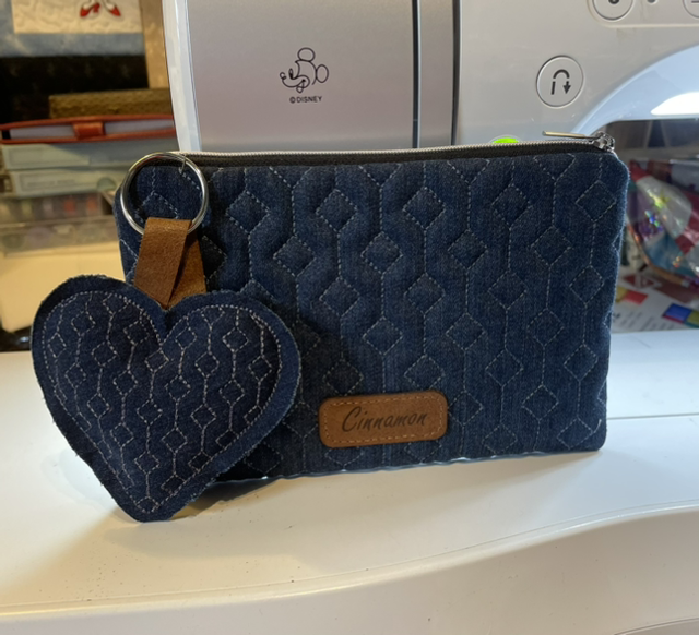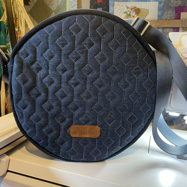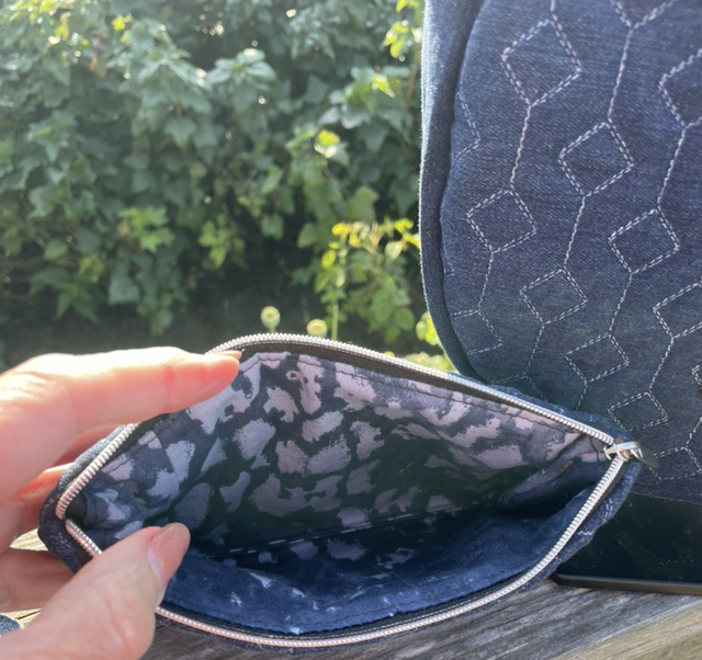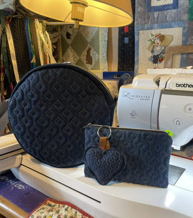 All items are quilted/embroidered with an unusual diamond pattern in a variegated 'jeans' denim thread.