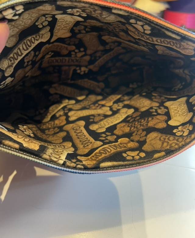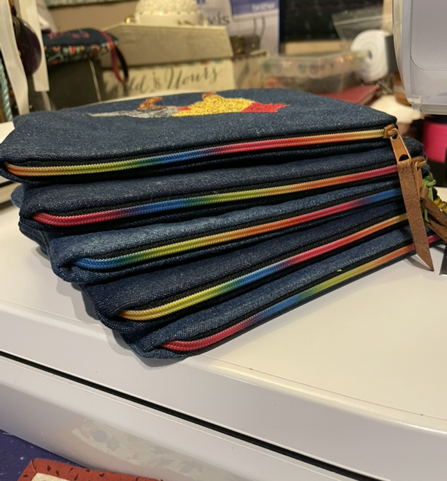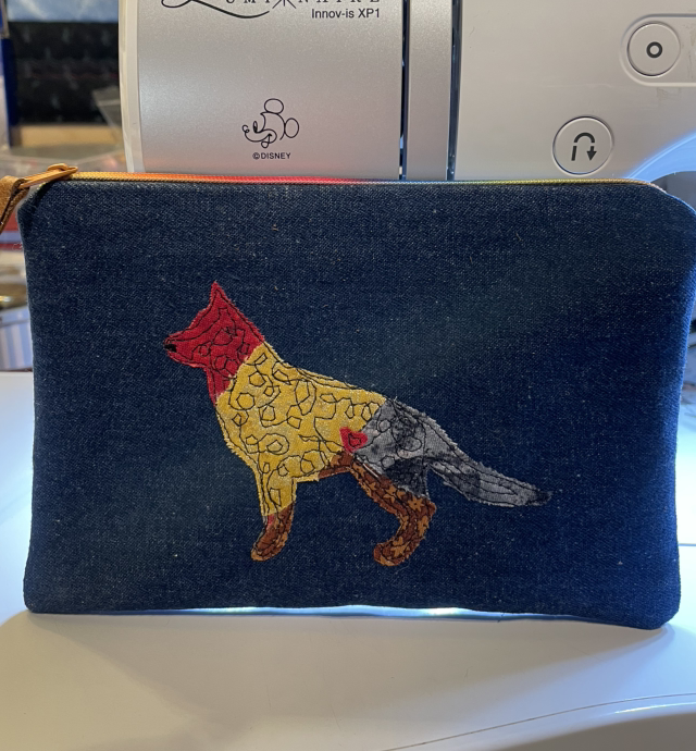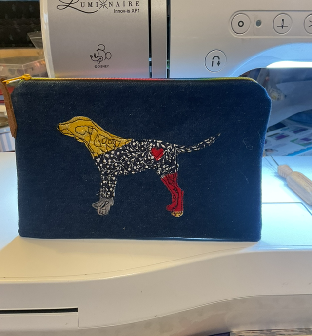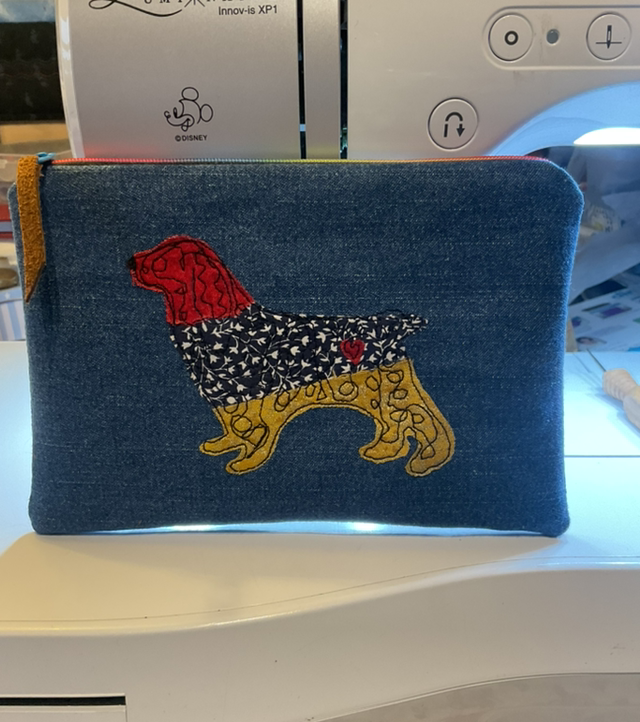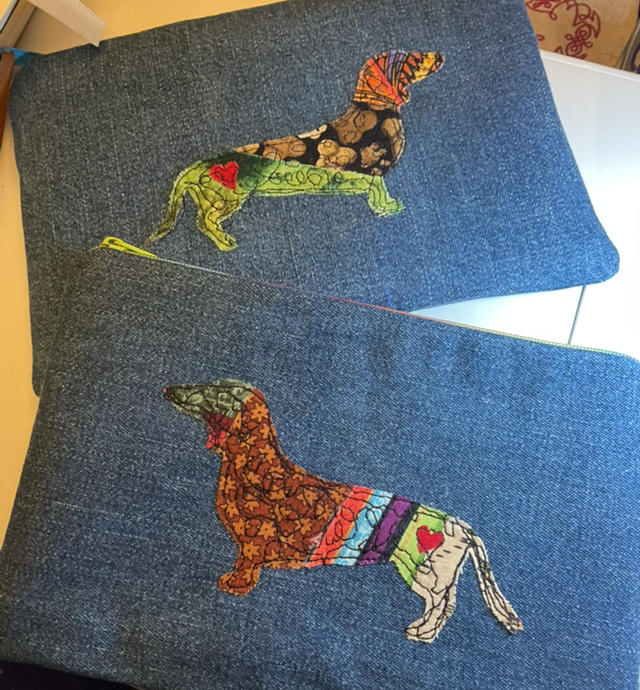 A small range of useful pouches made from denim adorned with colourful appliquéd dogs in a raw edge style.