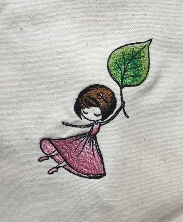 A simple canvas crossbody with an adjustable webbing strap embroidered with a sweet little girl floating along with a leaf.