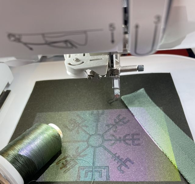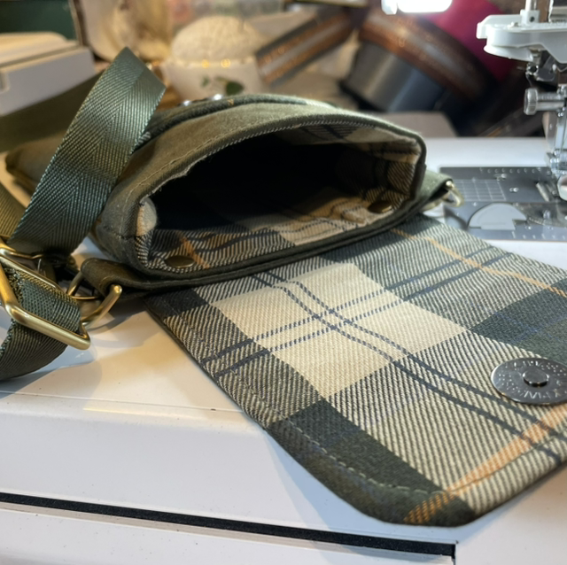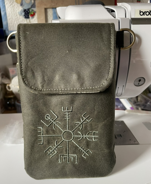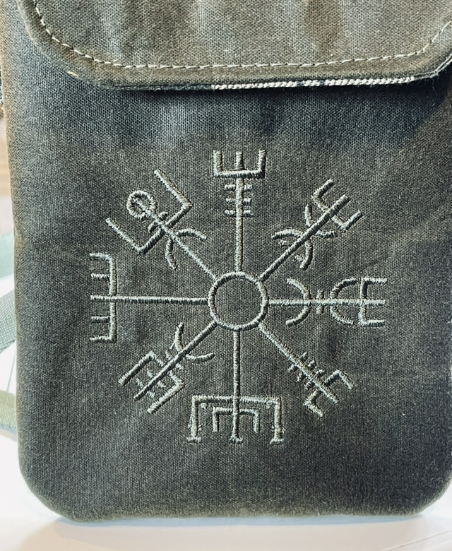 Made in oiled cotton (Barbour-type fabric) and lined in plain cotton, it is embroidered with a Vegvisir and finished with brushed brass hardware. It also has a long, adjustable strap in toning seatbelt-type webbing.
