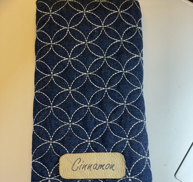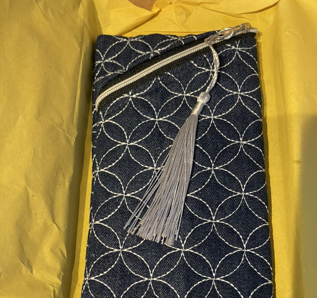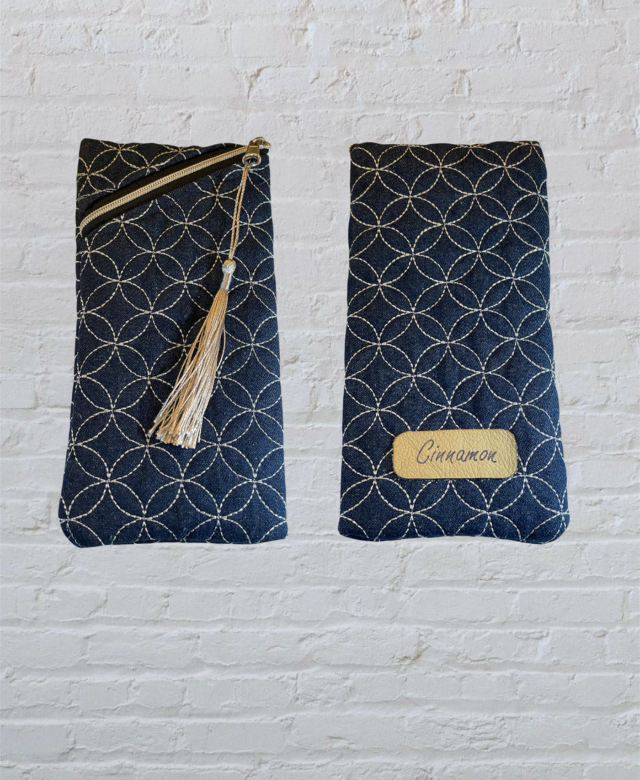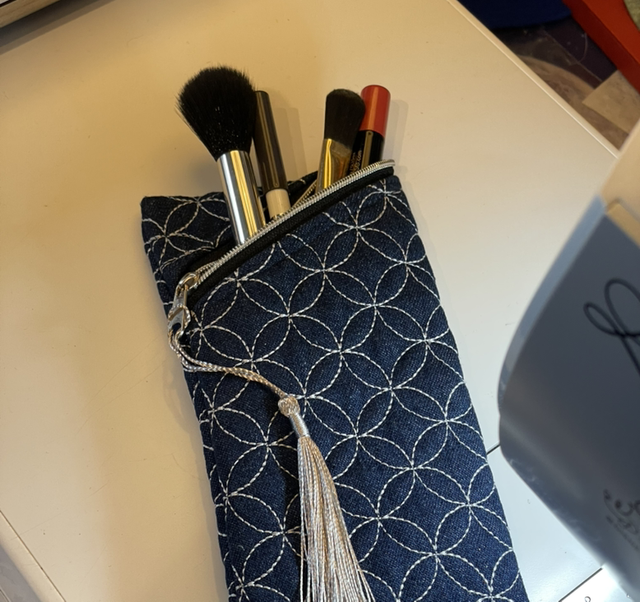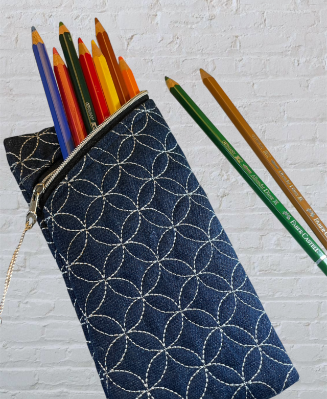 A zip-top, slimline quilted pouch which has a multitude of uses! Made from denim - quilted in a Sashiko design - and fully lined, this pouch meets so many needs from glasses case to storage for pencils, make up brushes or even crochet hooks.