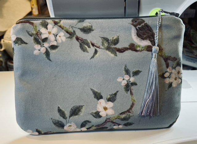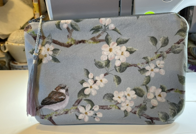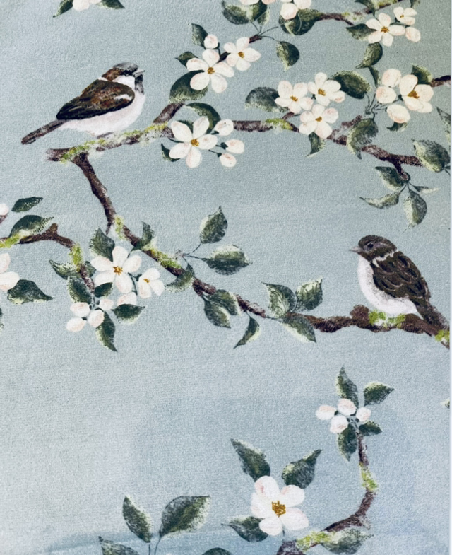 Sparrow in the blossom measures approximately 7 x 5 inches, and is made from printed cotton velvet by designer Celina Digby. It features a tiny sparrow perching in an apple tree surrounded by blossom on a duck egg blue background.