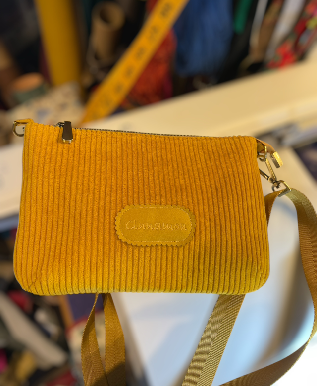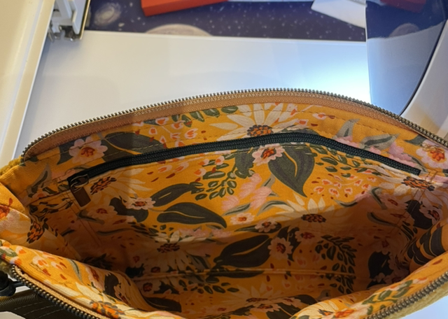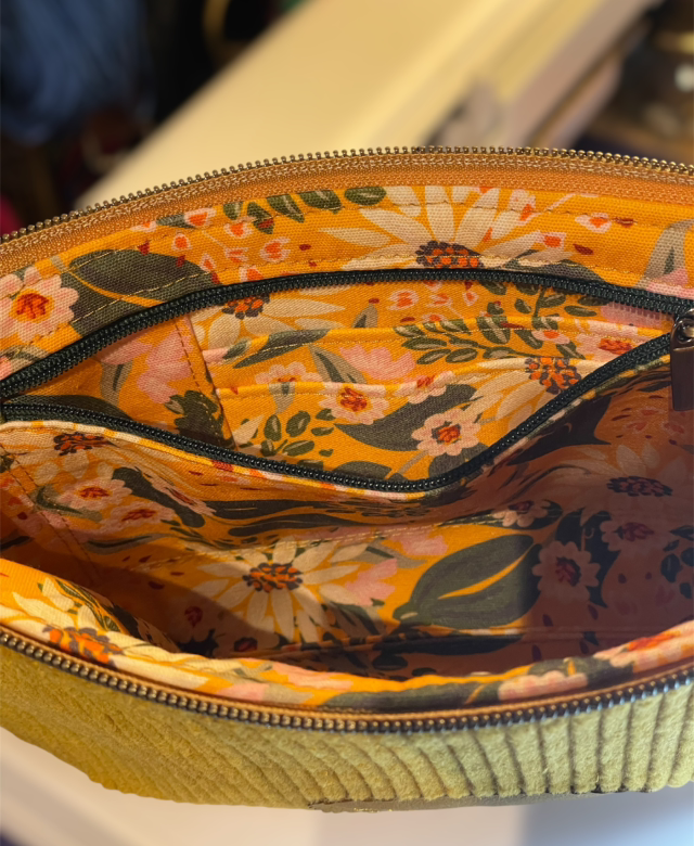 Made from on-trend vibrant yellow corduroy, this fun crossbody - with its adjustable golden strap - opens up to reveal a bright floral interior.