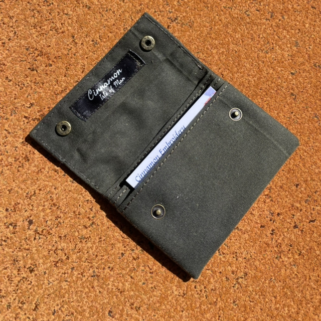 A neat little wallet in waxed cotton - Barbour-type fabric - embroidered with a lovely fox. Room for several credit cards and some folding money. Ideal to slip into your pocket when you are off to the Farmers’ Market.