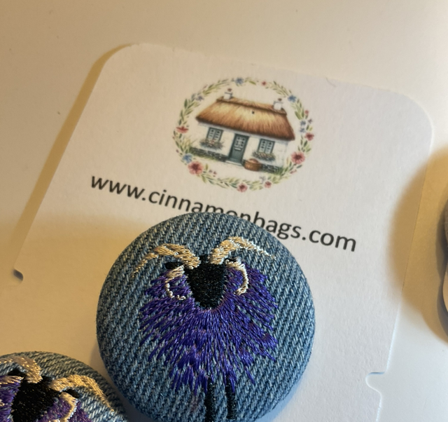 Add a unique touch to your own handmade creations with these 38mm buttons covered in denim and embroidered with a design celebrating our rare breed sheep here on the Isle of Man - The Manx Loughtan.