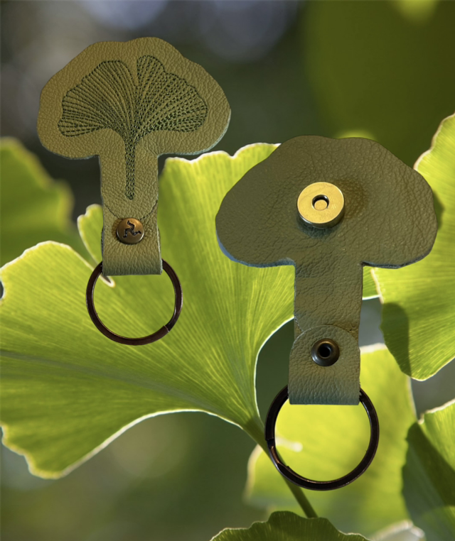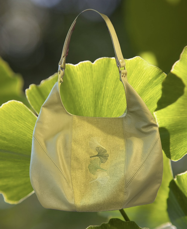 Measuring approx 14 inches 35.5 cm) wide by 11.5 inches (29 cms) high and 4 inches (10 cms) deep. The central panel is made of Abraham Moon wool embroidered with a spray of Gingko leaves. Inside is a zipped pocket, finished with a gold zip and leather placket, to which is attached a magnetic, detachable, key fob. It is lined with 100% cotton with a contrasting pattern of Gingko leaves. The strap is composed of webbing-backed leather..