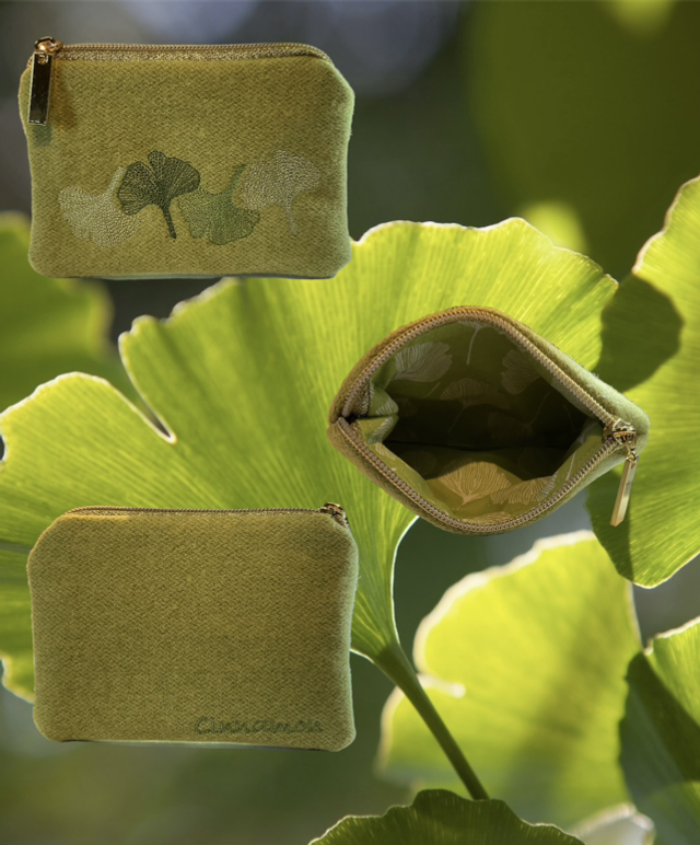 Made of Abraham Moon wool and lined with cotton, the pouch is embroidered with a spray of Gingko leaves and closes with a golden zipper. It measures approx 6 x 4 inches (15 x 10 cms)