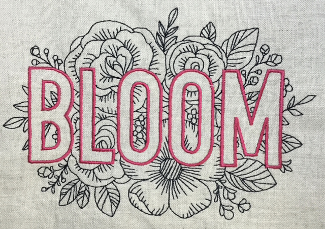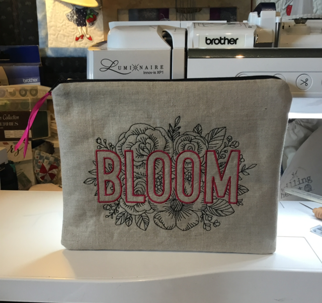 A pure linen pouch with a zingy lining embroidered with the word ‘Bloom’ against a background of embroidered flowers.