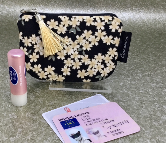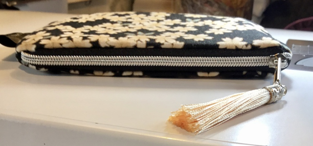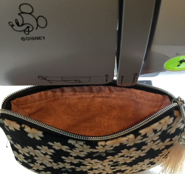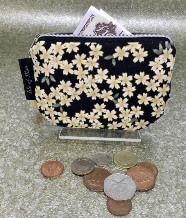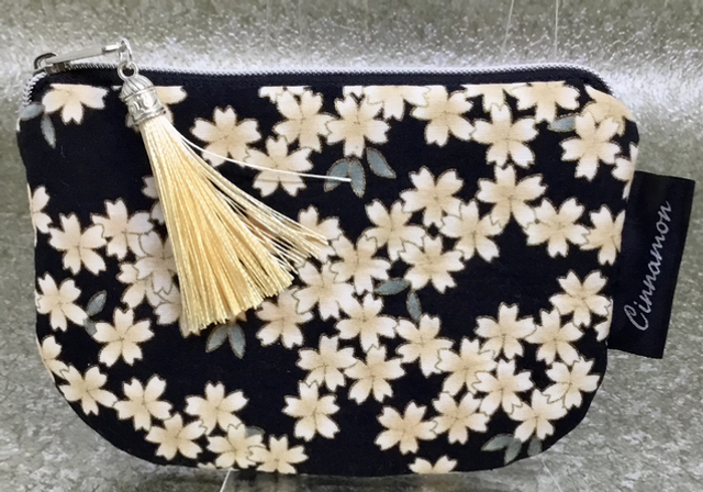 So I’ve chosen a cute cherry blossom fabric in 100% cotton for this little coin purse. It is also lined in 100% cotton in a peach shade and its black, silver toothed zipper is finished with a long silken tassel. It’s lightly padded to give it shape and feels so good in the hand!