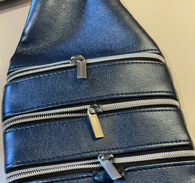 Metallic, petrol blue faux leather, brushed silver hardware and zips. Lined in cotton with a dragons tooth pattern.