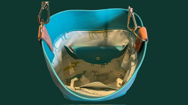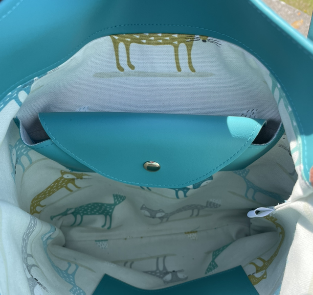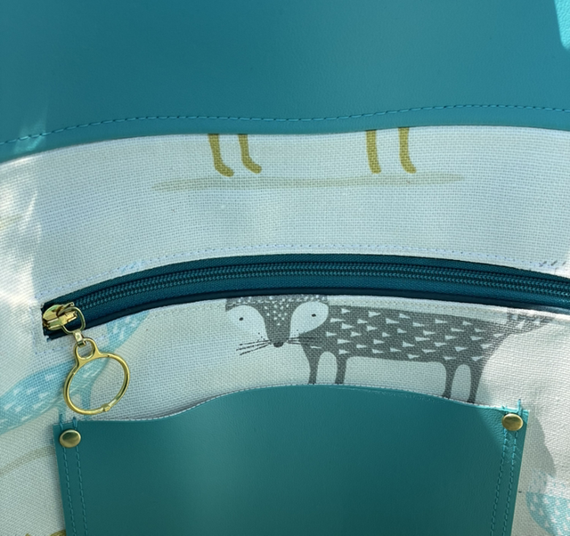 The fun, fox patterned linen lining - which will make you smile each time you open your bag - features not only a zip pocket with a slip pocket on the outside but an integral, custom glasses pocket. No more digging around in the bottom of the bag for those elusive specs.