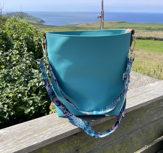 A lovely feature of this bag is the adjustable woven strap which picks up the vibrant colour of the vinyl. It is securely riveted to the bag by means of gold coloured rivets and peach leather accents. The strap is detachable so you can also use the tote for storage if you wish.